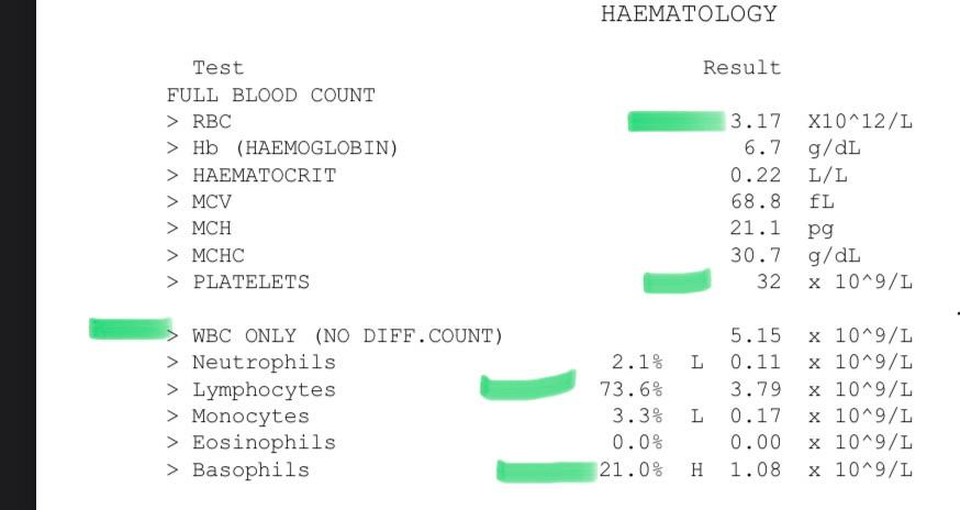A CBC is often the first laboratory test performed. Typical findings in ehrlichiosis include: